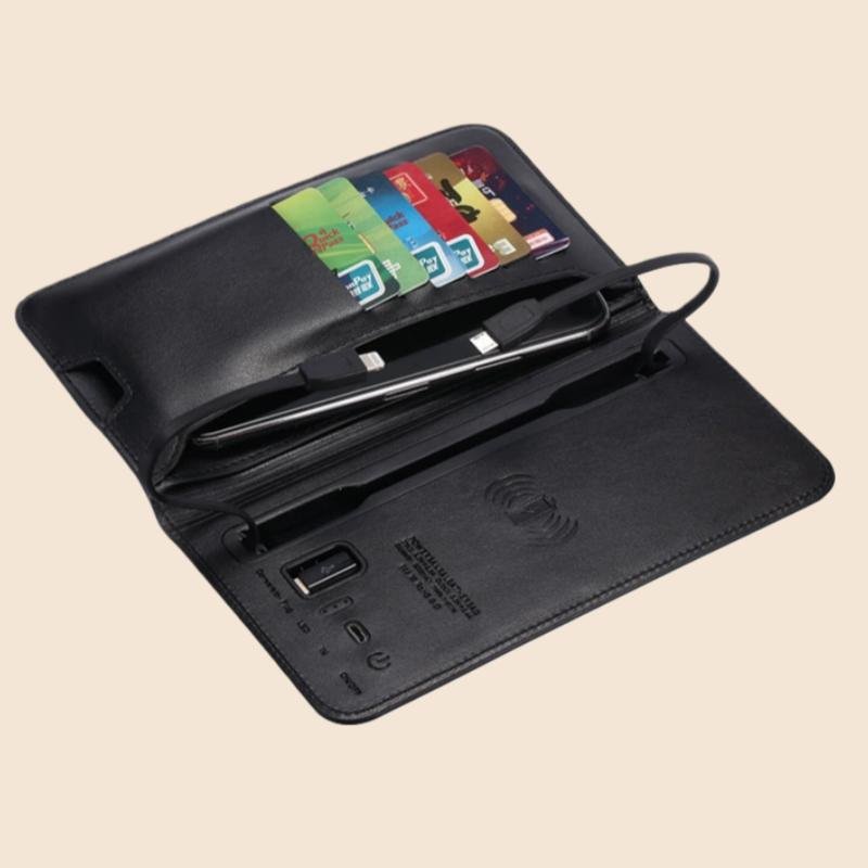محفظة باور بانك هي منتج ثنائي الوظائف يجمع بين وظائف الشاحن المحمول وسعة تخزين المحفظة التقليدية. إنها "محفظة تشحن هاتفك".“