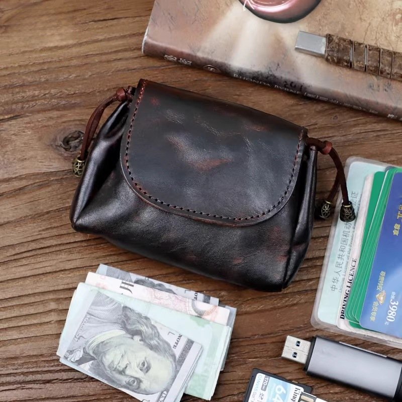 A leather coin purse is a small, flat case used to carry coins and folded bills. Lightweight, soft, and small enough to throw in a bag or pocket, it lends a casual, minimalist style.