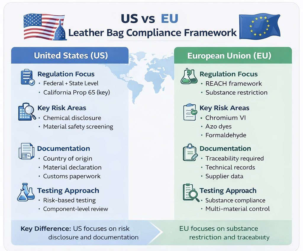 Although both markets expect safe and compliant consumer products, the compliance framework is not identical in the US and the EU. A capable leather bag manufacturer should understand the difference and know how to prepare materials, hardware, testing support, and documents accordingly.