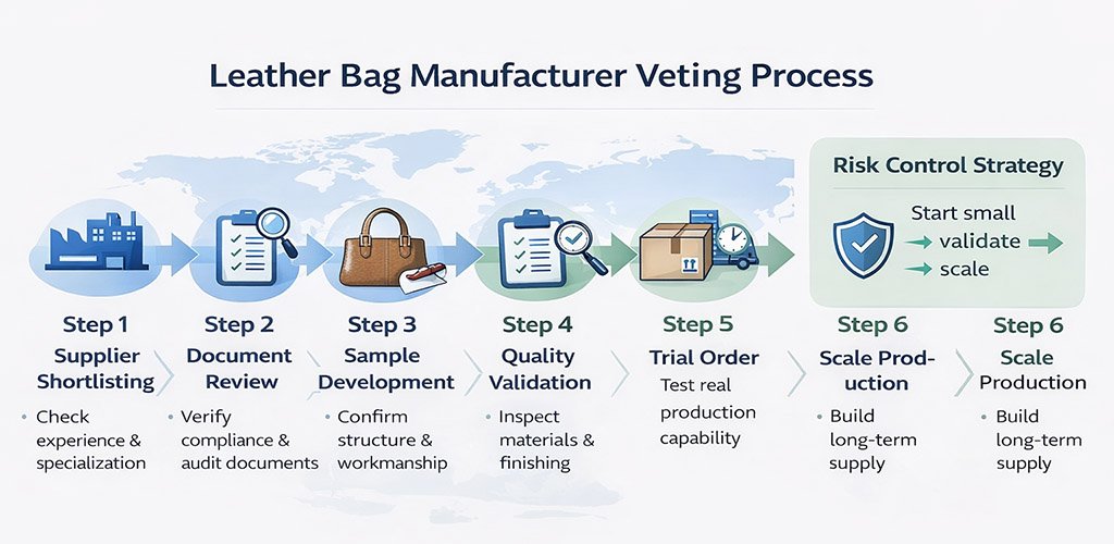 When shortlisting a leather bag manufacturer for Western markets, buyers should evaluate more than craftsmanship. The supplier should demonstrate operational maturity, export readiness, traceability, and structured internal control.