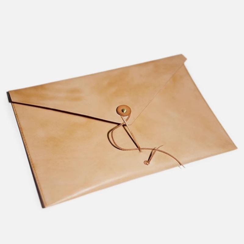 Smooth leather, imitation leather, and natural vegetable-tanned leather are available. Put a pen loop and a card slot inside the bag. Carry your documents in a big envelope or a black clutch.