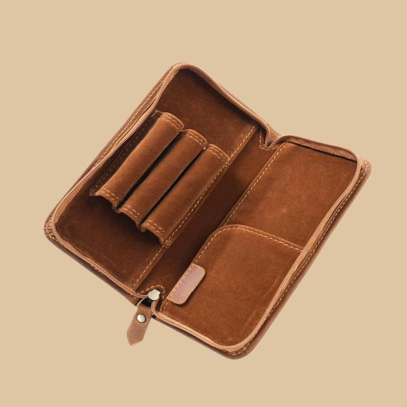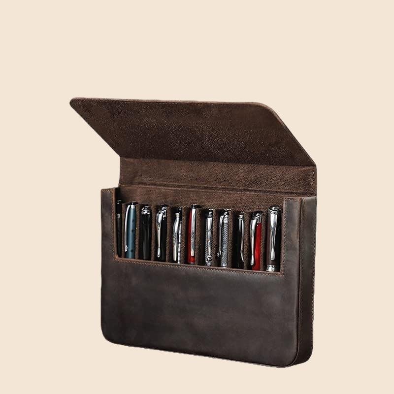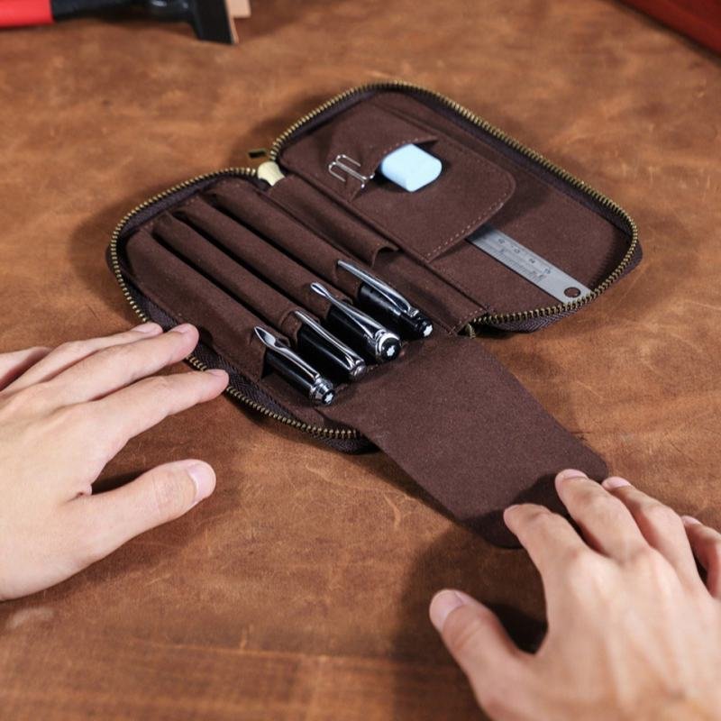- For those who collect and use pens, like fountain pens, our multiple-compartments leather pencil cases protect valuable items.